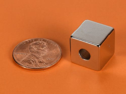 These handy 1/2" cubes have a 3/16" hole through the center which is perpendicular to the magnetization direction. This means that the poles are located on two opposing sides without the holes. These cubes are great for suspending metal objects and signs from a string. They can also be used to hang a string from a metal ceiling or beam. The string can be knotted or looped through the cube to secure it. These cubes have thousands of applications. If you are looking for part number B888-3, here it is! Same magnet, new part number.