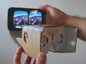 Google Cardboard is a design for a 3D virtual reality headset made with a smartphone and cardboard! The free design online at Google shows the cardboard shapes you need and how to assemble it together. It also mentions that you need two lenses for focus, and two magnets.