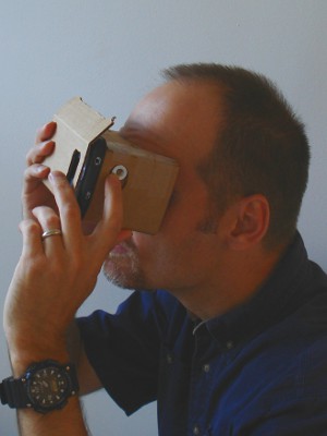 The cardboard box holds an Android smartphone in a position that's in front of your eyes, with some lenses between them. On the screen, two slightly different images are shown on the left and right sides. Each one of your eyes is looking at the image in front of it. Because the images can be made different, a 3D effect can be constructed.