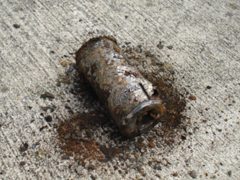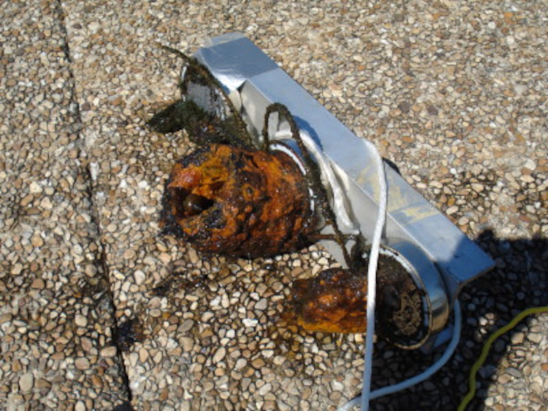 Next, we tossed the bigger magnets off the end of the dock, searching for whatever we could find. On one of our first throws, we captured a big pipe elbow and a large fishing hook. The heavy, rusty pipe was an easy grab for the powerful magnets. A few snails nestled inside the pipe came along for the ride.