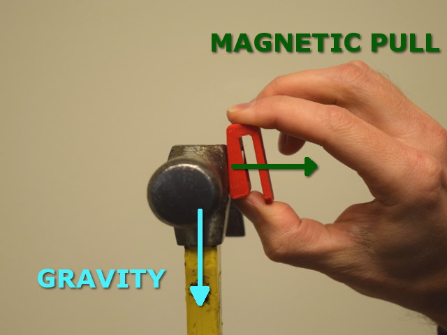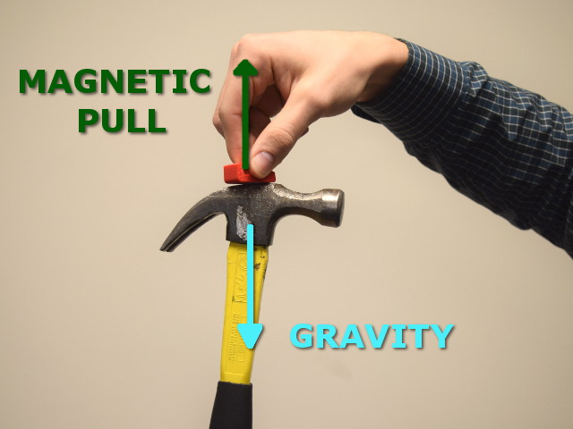 The head of the hammer is a nice, thick steel surface for the magnet to grab onto. If we use the magnet to hold the hammer from above, it's more than strong enough. Gravity pulls down with 1.5 lb of force, and the magnet pulls up at something close to 9 lb of force. The hammer sticks to the magnet.