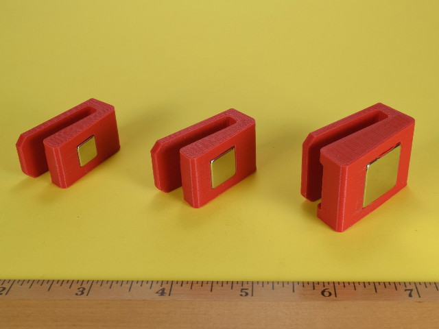 Successively bigger magnets in the same belt-clip design. Left to right: An SB664-OUT block magnet is 3/8" square x 1/4" thick, an SB884-OUT block magnet is 1/2" square x 1/4" thick and the SBCC6-OUT block magnet is 3/4" square x 3/8" thick.