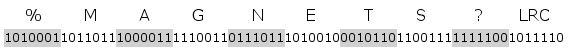For each letter, we assign a number according to the Decimal Sixbit table (shown in the Wikipedia link), an earlier character encoding scheme that preceded ASCII. In this ISO format, we start our data string with a % symbol and end with a question mark. For our string of characters "MAGNETS", we actually encode the string: "%MAGNETS?". The binary encoding looks like: