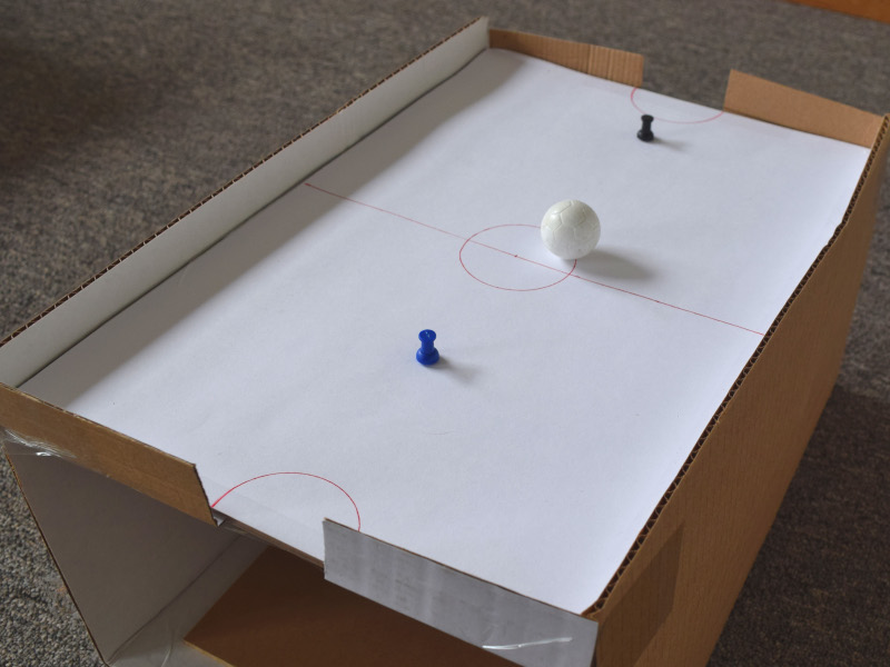 This is perhaps the simplest of our three versions, all you need is a table (preferably 1" thick or less) and some items you have around the house. We put a large piece of paper down and sketched a playing field. For the field boundaries, we used some books and notepads. A gap in the boundaries at either end would create the goal.