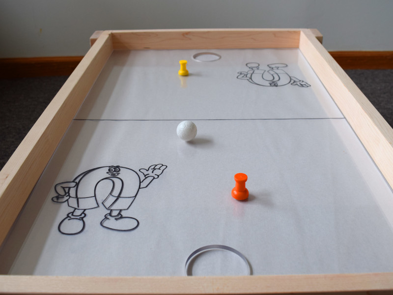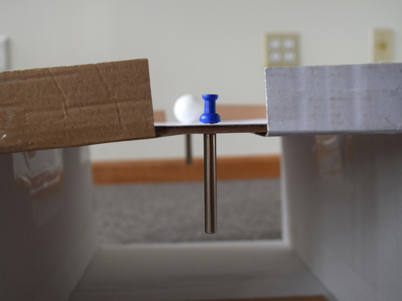 The tabletop we used was 3/4" thick. For this distance, we used our extra large thumbtacks, attracting to a DCY0 cylinder underneath. If your table is 1" thick, consider adding a DA2 onto the thumbtacks for increased strength. A table more than 1" thick wouldn't be a feasible playing surface, the magnetic strength is too weak (remember that distance really matters with magnets!)