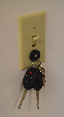 Here's another simple idea that brings a smile to everyone who tries it out. Strong neodymium magnets placed behind a light switch make a great key-ring holder!