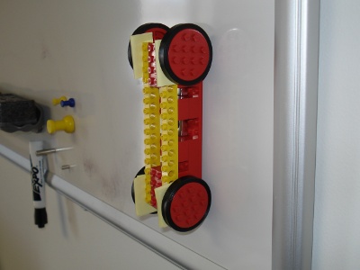 A simple bot made from Lego parts and a single BX884DCS magnet, stuck to a magnetic whiteboard. Details such as controls and motors omitted!