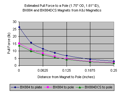 To put some actual numbers to this, we considered our BX884 and BX884DCS magnets in the following examples. It is a good magnet for this application, especially if the robot is not too heavy. They're strong, not too wide (and won't overhang away from the pole as much) and can be easily attached with flathead machine screws. For greater strength, they are easily stacked 2 or 3 high. The listed Pull Force Case 1 of this magnet is almost 24 lb. To find the pull force to a flat plate at various distances, use our online Pull Force Calculator. The Calculator results for various magnet-to-pole distances are shown in the graph below as "BX884 to plate."