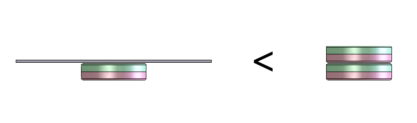 With magnet-to-steel setups, you don't get this same "centering" force. In fact, a magnet will happily sit just about anywhere on a larger piece of steel. They won't pull to center on one another. This is great if you're making a magnetic cabinet latch, where the position of the cabinet door might vary a bit. With the steel strike plate that's larger than the magnet, the force feels the same despite minor positional changes.