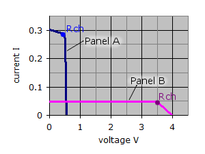 In the graph at right, that resistance occurs right at the bend of each panel spec. While both panels represented can offer a similar amount of power (Watts), one will offer higher currents at a lower voltage, while the second offers a much lower current but at a higher voltage.