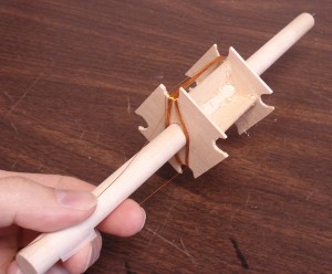 We constructed the rotor frame from light wood, held together with hot-glue-gun glue. It may not be the most accurate construction method, but it was a fast way to experiment with an easily modifiable prototype quickly. We used thin wood from a craft store that was easily cut with a hobby knife.