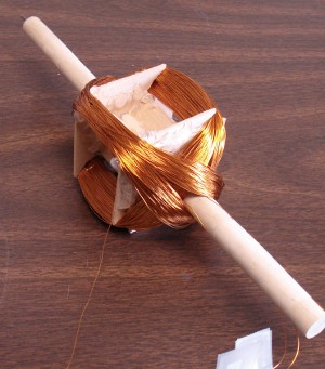 We chose 30 gauge (30AWG) magnet wire and used about 1,000 turns in each coil. This was more turns of wire, and heavier than most motors we've seen. There are some great looking motors online that use as little as 100 turns. That's a good thing if you don't want to use such big magnets - our floating piece weighed in at half a pound. Copper is heavy!