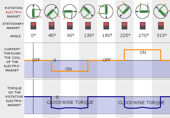 In the graphic below, we change the rotating magnet into an electromagnet, represented by the classic example of wire wound around a nail. In one region, from 45 to 135 degrees of rotation, we run current through the electromagnet in one direction. To keep trying to rotate the spinning electromagnet in the same clockwise direction, we run current in the opposite direction in the 225 to 315 degree region.