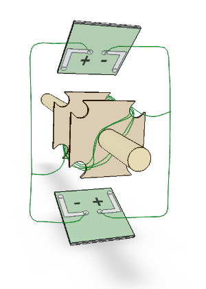 We wired the panels as shown in the sketch below. The sketch shows just one set of panels with a single coil of wire. The coil only shows a few turns, for clarity. In the motor we constructed, we added a second set of panels and coil of wire in the same fashion.