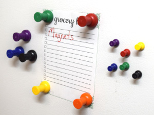 Magnetic thumbtacks are a great and colorful way to hang photos, recipes, to do lists and more up on the fridge. Also see our Fridge magnets for more options for hanging on a fridge with magnets.
