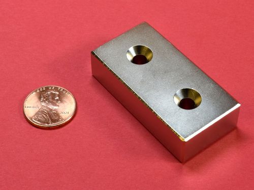 The BY0X08DCS-N52 is a very powerful, 2" long magnet with nearly limitless possibilities. Two double countersunk holes on either side make this strong block perfect for attaching to wood, aluminum, stainless steel or plastic surfaces. The countersunk holes are the same on the North and South side of this strong block, making it reversible. Great for applications that may not have otherwise been able to harness the incredible strength of Neodymium Magnets!