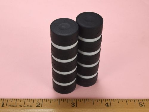 These great magnets are coated with a durable layer of protective thermoplastic. The 3/4" x 3/8" dimensions are the finished dimensions of the thermoplastic. These discs can be slammed together many times without damage. They won't mark or scratch surfaces they come in contact with.