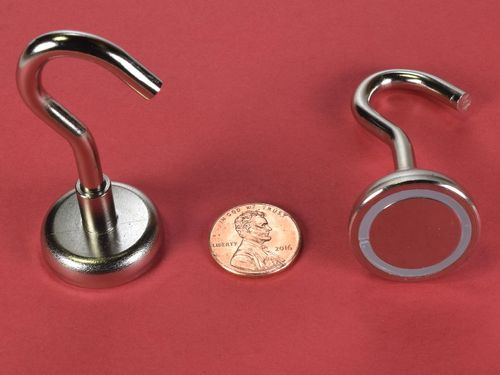 Here we offer one of the most useful magnets known to man - an incredibly powerful magnet with a hook attached. Need to hang something in or on your locker? fridge? filing cabinet? This is what you need. If you've ever fought to position a drop light while you were working on a car, or anything for that matter, you understand how valuable one of these hooks could be for unrestricted light placement. The possible uses for these great hook magnets are unlimited! The hook, magnet and mount are all nickel plated to resist corrosion and to provide that nice shiny, silver finish.