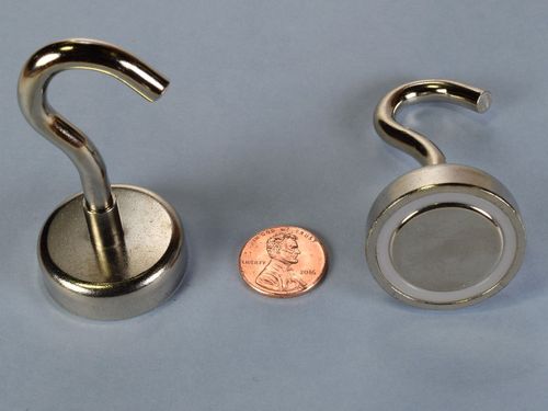Here we offer one of the most useful magnets known to man - an incredibly powerful magnet with a hook attached. Need to hang something in or on your locker? fridge? filing cabinet? This is what you need. If you've ever fought to position a drop light while you were working on a car, or anything for that matter, you understand how valuable one of these hooks could be for unrestricted light placement. The possible uses for these great hook magnets are unlimited! The hook, magnet and mount are all nickel plated to resist corrosion and to provide that nice shiny, silver finish.
