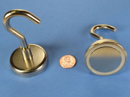 Here we offer one of the most useful magnets known to man - an incredibly powerful magnet with a hook attached. Need to hang something in or on your locker? fridge? filing cabinet? This is what you need. If you've ever fought to position a drop light while you were working on a car, or anything for that matter, you understand how valuable one of these hooks could be for unrestricted light placement. The possible uses for these great hook magnets are unlimited! The hook, magnet and mount are all nickel plated to resist corrosion and to provide that nice shiny, silver finish.