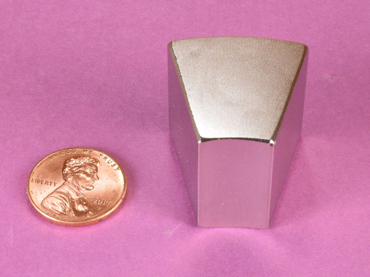 This arc segment is designed so that 12 of them will combine to form a ring of 4" od x 2" id, with alternating poles. To form the ring, you will need 6 AY0X030-N and 6 AY0X030-S. This arc is magnetized through the radius, with the south pole on the outer face. Twelve of these can be forced together and contained in a ring, to form a pseudo radially magnetized ring with the south pole around the outer circumference. These can also be combined with our AY0X030-C and AY0X030-N to form a circular Halbach array.