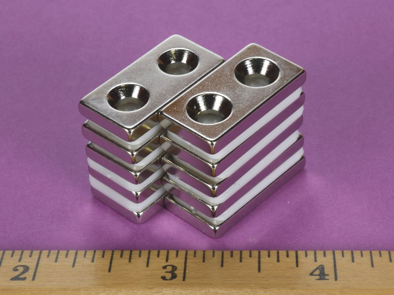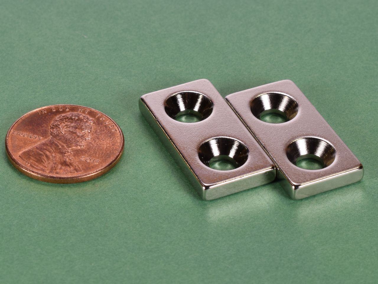 Here we offer the popular size of 1" x 1/2" in 1/8" thickness with holes for two #6 flathead screws to allow for easy fastening. Sold by the pair as our part number BX082CS-P. One will have the north pole on the countersink side and one will have the south pole on the countersink side, so they will attract each other when they are screwed in place.