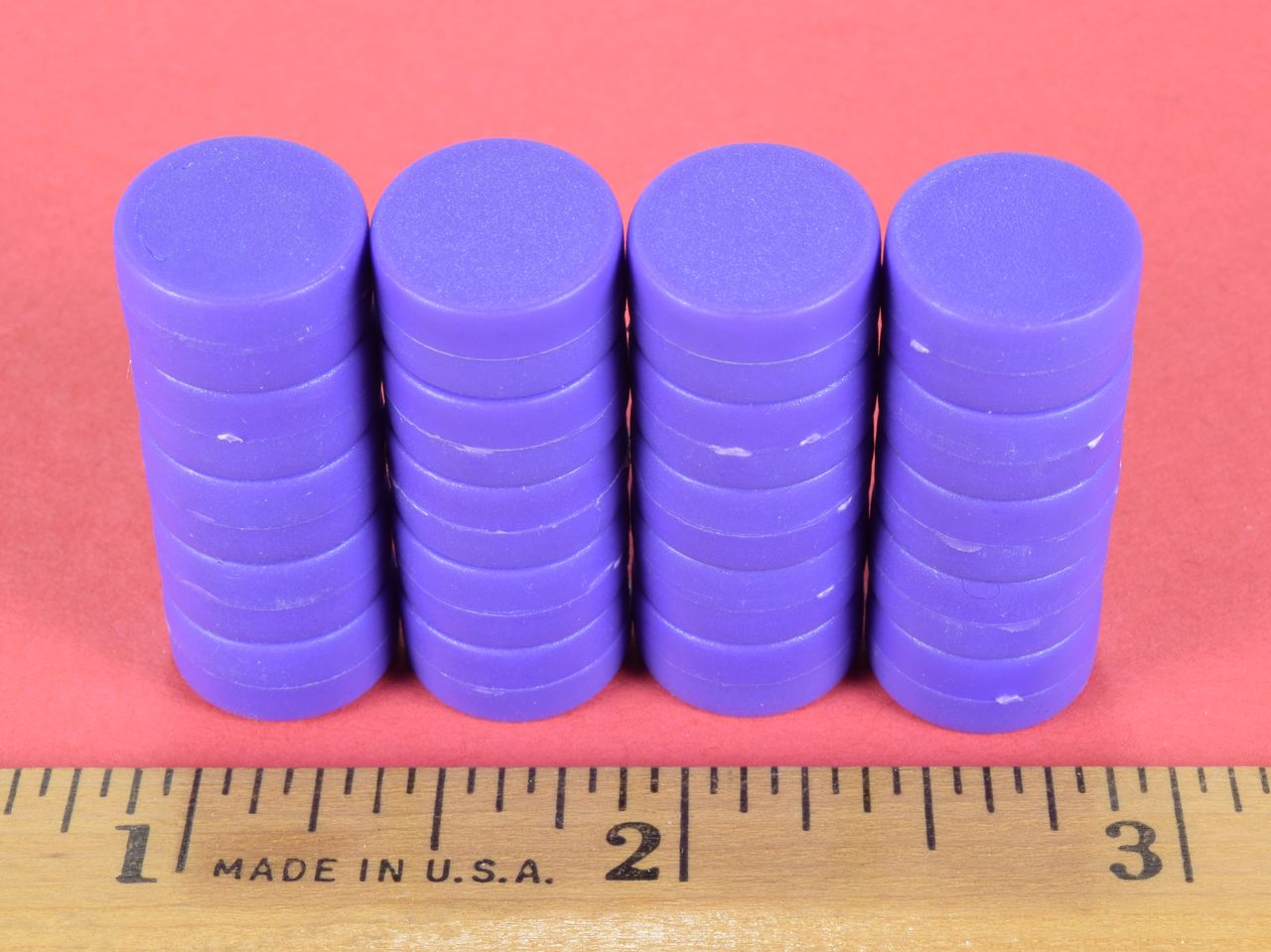 These great magnets are coated with a durable layer of plastic. The 1/2" x 1/4" dimensions are the finished dimensions of the plastic coating. These discs can be slammed together many times without damage. They won't mark or scratch surfaces they come in contact with. They are also completely weatherproof. Please note: Slight color variation may occur from order to order.