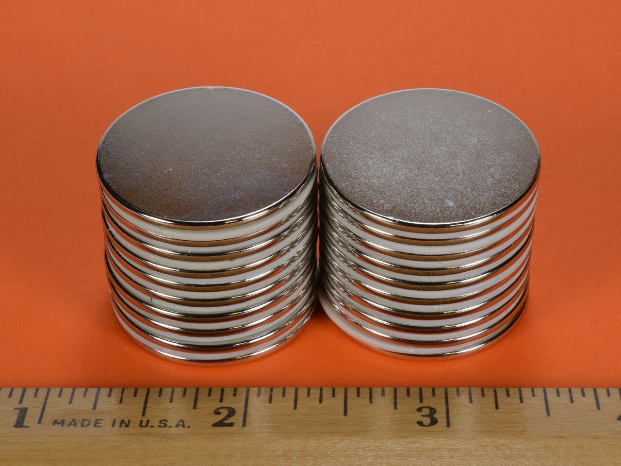Coating: Most neodymium magnets are plated or coated in order to protect the magnet material from corrosion. Check out our Custom Magnets for unplated magnets and other coatings not stocked for this size magnet. Learn more about all available platings and coating in our What Magnet Coating Should I Use? article.Nickel-Copper-Nickel (Ni-Cu-Ni)