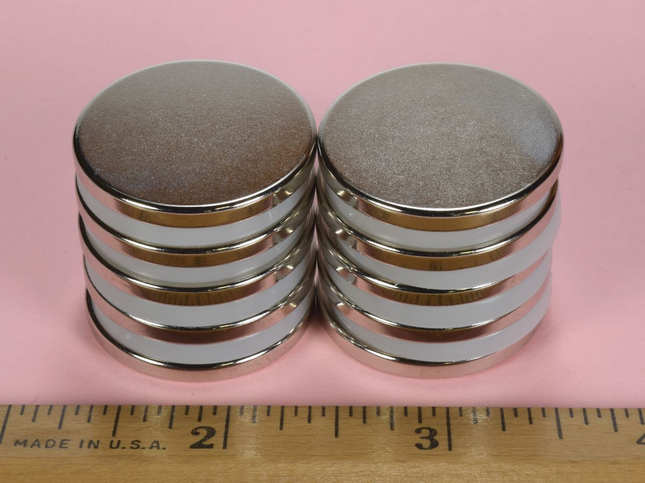 Coating: Most neodymium magnets are plated or coated in order to protect the magnet material from corrosion. Check out our Custom Magnets for unplated magnets and other coatings not stocked for this size magnet. Learn more about all available platings and coating in our What Magnet Coating Should I Use? article.Nickel-Copper-Nickel (Ni-Cu-Ni)