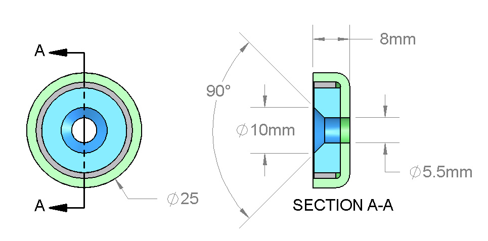 The MM-A style is a flat mounting magnet with a tapered hole to recess a screw head. One can be attached to an object that needs to be hung from a metal surface, or it can be screwed to a wall, ceiling or fixture to hold metallic objects in place. Incredibly handy!