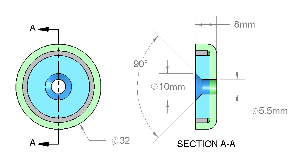 The MM-A style is a flat mounting magnet with a tapered hole to recess a screw head. One can be attached to an object that needs to be hung from a metal surface, or it can be screwed to a wall, ceiling or fixture to hold metallic objects in place. Incredibly handy!