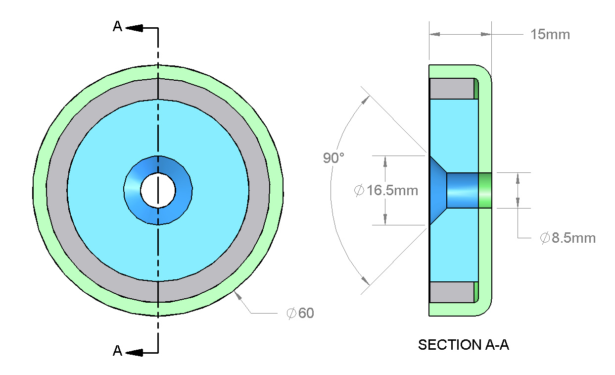 The MM-A style is a flat mounting magnet with a tapered hole to recess a screw head. One can be attached to an object that needs to be hung from a metal surface, or it can be screwed to a wall, ceiling or fixture to hold metallic objects in place. Incredibly handy!