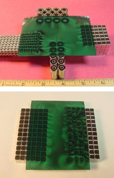 In the second picture, you can see the film on top of two blocks of the same 1/4" cube magnets. In the block on the left, the poles of the magnets are facing the film, so the tops of the magnets appear dark. On the block of cubes on the right, the poles are facing up and down in the picture, parallel to the film. You can see the difference in the magnetic field patterns on the film. This film is RoHS compliant.