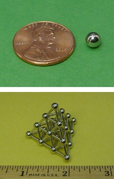 Nickel-plated steel balls have the exact same finish as our nickel plated magnets. A small triangular pyramid sculpture can be built using 20 NSB3 steel balls and 60 of our D14 cylinder magnets.
