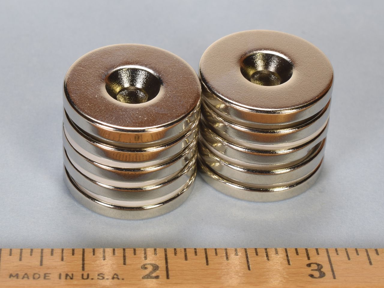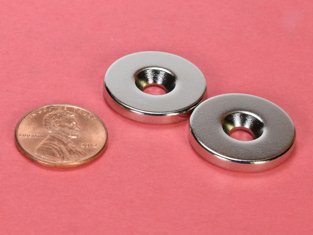 These are 7/8" diameter x 1/8" thick countersunk ring magnets sized to accept a #8 countersunk screw. Sold by the pair as our part number RE22CS-P-N52. One will have the north pole on the countersink side and one will have the south pole on the countersink side, so they will attract each other when they are screwed in place.