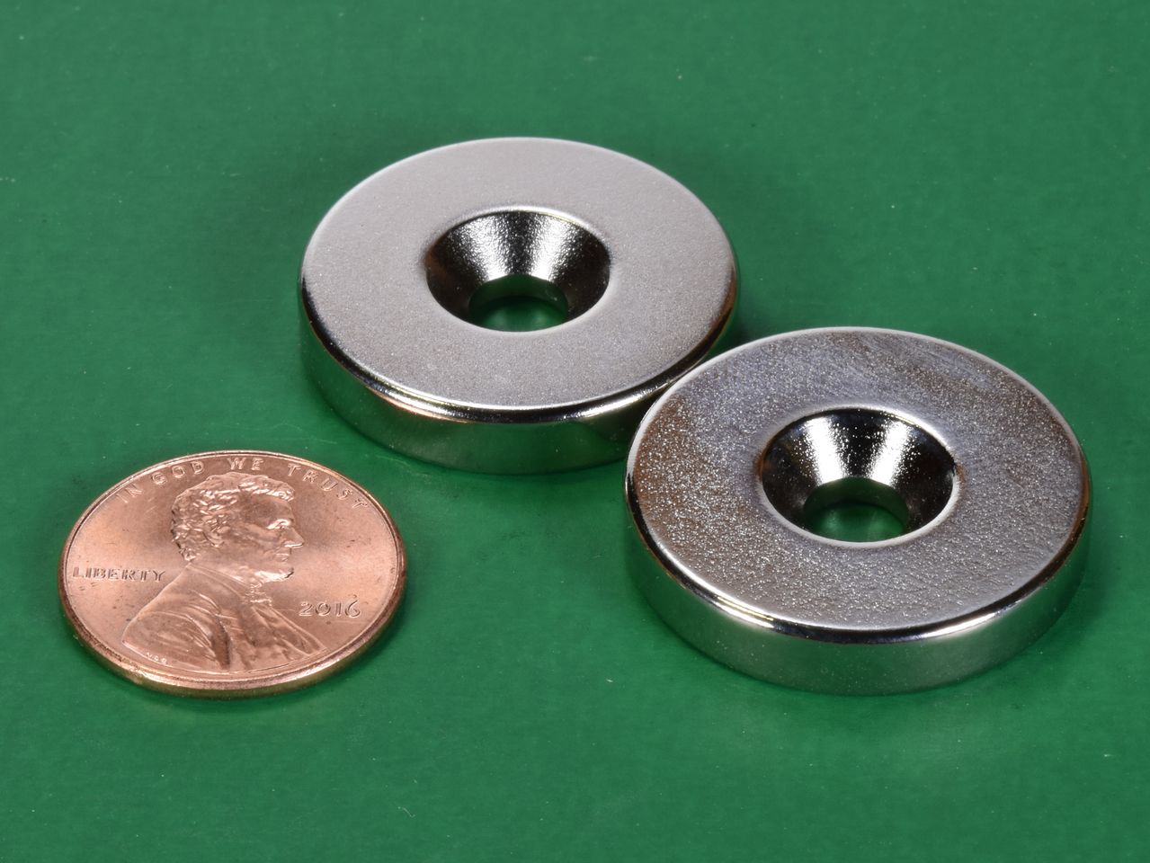 These are 1" diameter x 3/16" thick countersunk ring magnets sized for use with a #10 countersunk screw. Sold by the pair as our part number RX033CS-P. One will have the north pole on the countersink side and one will have the south pole on the countersink side, so they will attract each other when they are screwed in place.