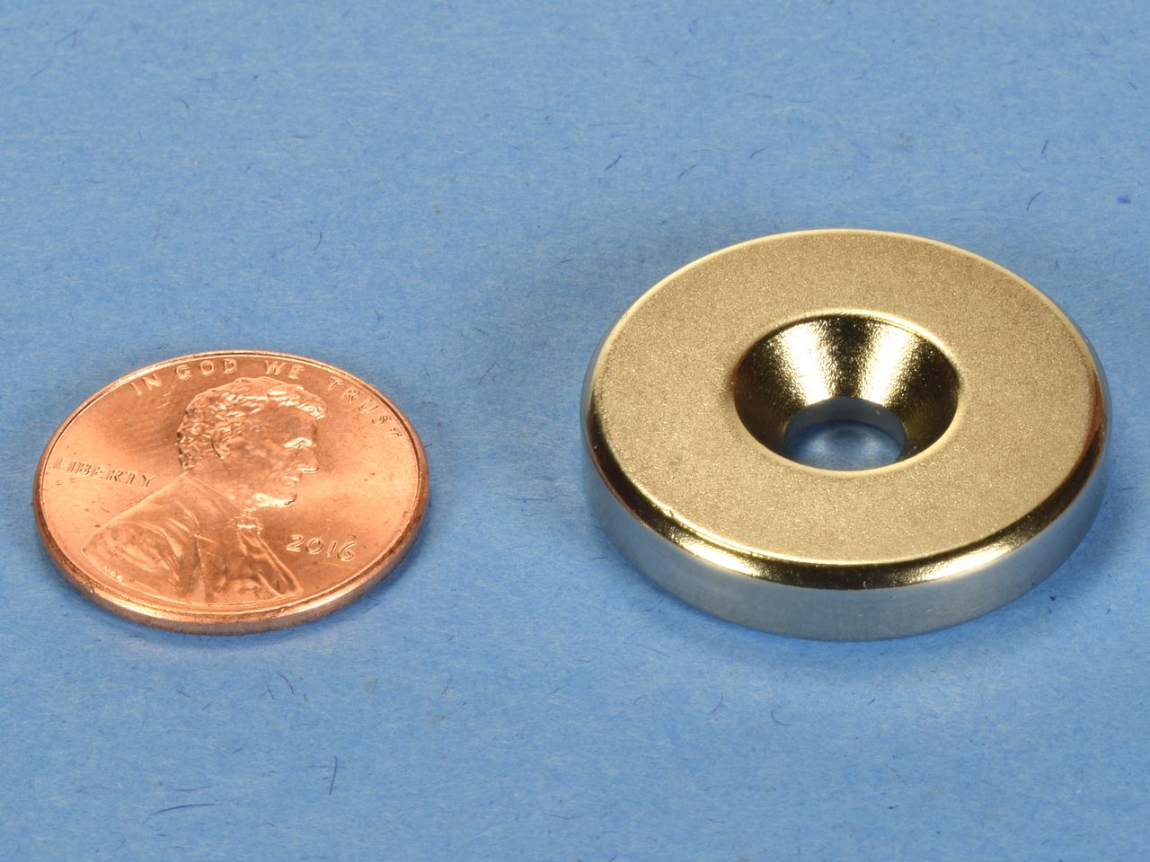 These are 1" diameter x 3/16" thick countersunk ring magnets sized for use with a #10 countersunk screw. The RX033CS-S is magnetized with the south pole on the countersink side.