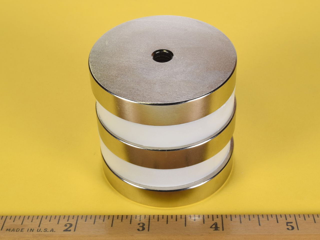 These sturdy rings are quite useful. They are very strong and can easily be bolted to a wall for hanging heavy objects or holding tools in place. They are great for dragging on the ground or in water to retrieve lost objects. These rings are strong enough to repel each other with enough force to support the weight of one magnet at a height of over 4 1/2" as seen in the bottom picture on the left.