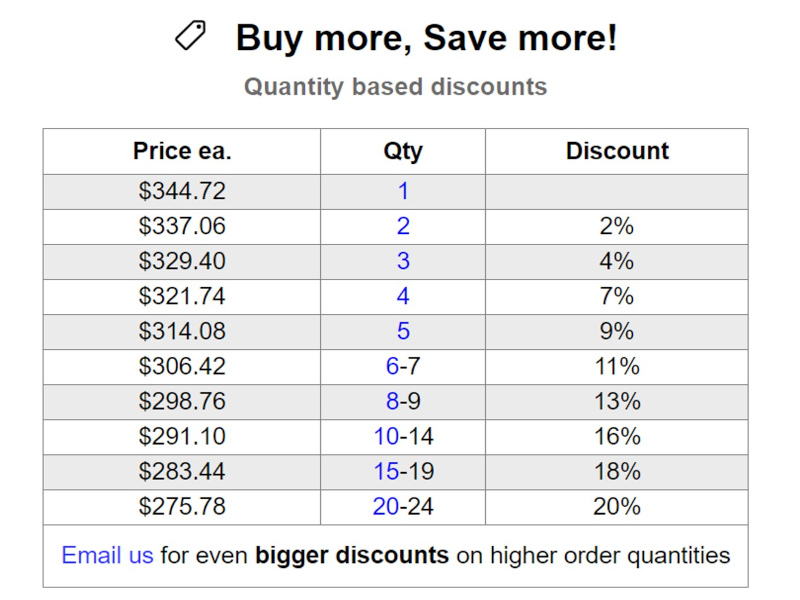 All current pricing and quantity discounts are listed directly on our website. Just navigate to the product page and check the quantity discounts table and start saving today!