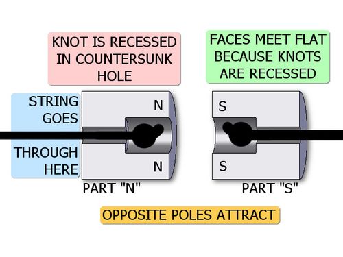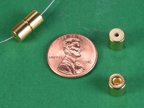 These gold plated rings are sold in pairs because there are two different magnetization directions on the rings to allow them to work as clasps. One of the magnets in the pair has the north pole on the countersunk hole side and the other has the south pole on that side. This allows the two faces to meet flat, as a knot fits inside the countersunk hole in the ring. The clasps are gold plated for a shiny, gold finish. The small hole is 1/21" and the large hole is 1/10".