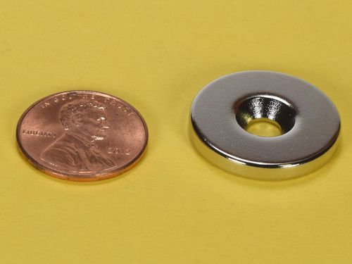 These are 7/8" diameter x 1/8" thick countersunk ring magnets sized to accept a #8 countersunk screw. The RE22CS-N is magnetized with the north pole on the countersink side.