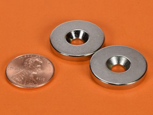 These are 7/8" diameter x 1/8" thick countersunk ring magnets sized to accept a #8 countersunk screw. Sold by the pair as our part number RE22CS-P. One will have the north pole on the countersink side and one will have the south pole on the countersink side, so they will attract each other when they are screwed in place.