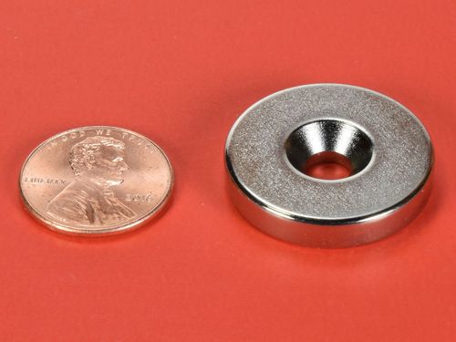 These are 1" diameter x 3/16" thick countersunk ring magnets sized for use with a #10 countersunk screw. The RX033CS-N is magnetized with the north pole on the countersink side.
