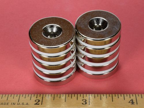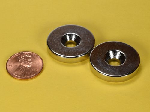These are 1" diameter x 3/16" thick countersunk ring magnets sized for use with a #10 countersunk screw. Sold by the pair as our part number RX033CS-P-N52. One will have the north pole on the countersink side and one will have the south pole on the countersink side, so they will attract each other when they are screwed in place.