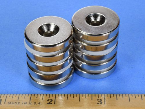 These are 1" diameter x 3/16" thick countersunk ring magnets sized for use with a #10 countersunk screw. Sold by the pair as our part number RX033CS-P. One will have the north pole on the countersink side and one will have the south pole on the countersink side, so they will attract each other when they are screwed in place.