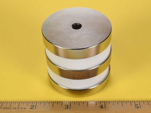 These sturdy rings are quite useful.  They are very strong and can easily be bolted to a wall for hanging heavy objects or holding tools in place.  They are great for dragging on the ground or in water to retrieve lost objects.  These rings are strong enough to repel each other with enough force to support the weight of one magnet at a height of over 4 1/2" as seen in the bottom picture on the left.