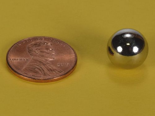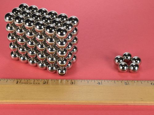 These sphere-shaped magnets are 7/16" in diameter. They are quite a bit stronger than our 1/4" spheres and might even pinch a little if you're not careful.