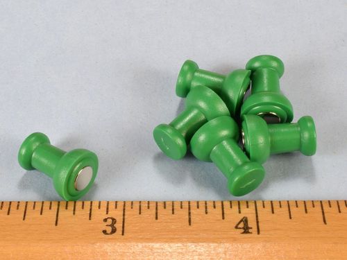 These neat magnetic thumbtacks (aka "pushpins") will hold 6 or more sheets of 8 1/2 x 11 paper securely to any metal surface. They can be used on a fridge, metal bulletin boards, filing cabinets and on other metal surfaces. They can even be used to hang things from drywall screws or nails in your walls! They are made of brightly colored plastic in a traditional thumbtack shape, with a super strong magnet disc on the bottom. They are a great addition to any home or office. They also make great gifts!