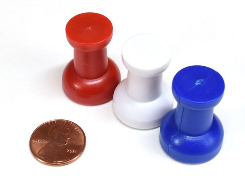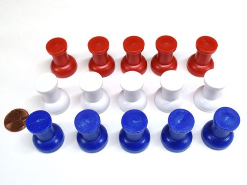 The USA assortment will contain 5 each of the red, white and blue thumbtacks. These large thumbtacks are twice the size of our standard magnetic thumbtacks. They are incredibly powerful and one will hold 15-20 sheets of 8 1/2" x 11" paper firmly to any ferrous metal surface. The are useful for holding maps, large prints, posters, presentations and other oversize items. They can be used on a fridge, white boards, filing cabinets and many other metal surfaces. They are made of brightly colored plastic in a traditional thumbtack shape, with a super strong magnet disc on the bottom. They are a great addition to any home or office. They also make great gifts!